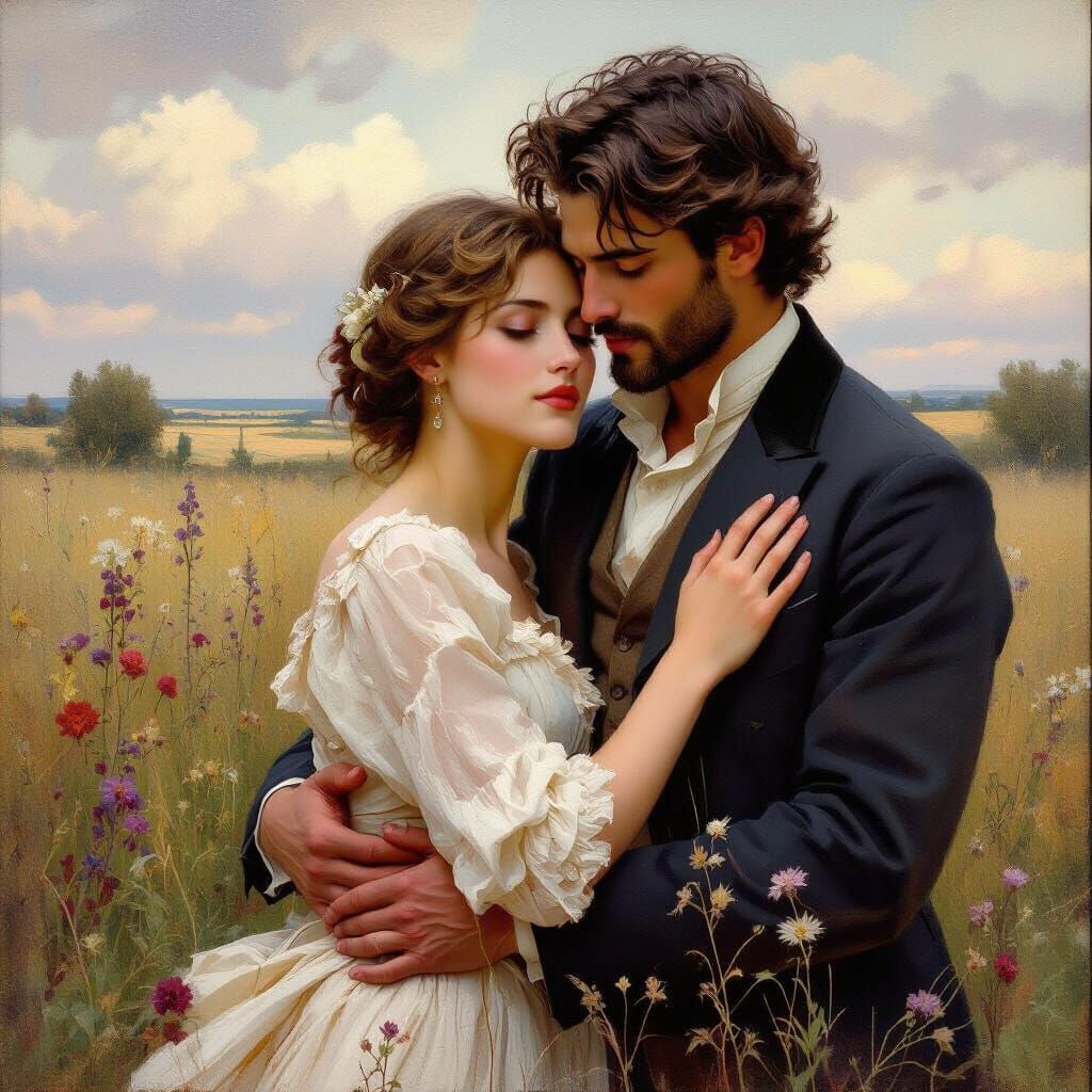 This image showcases an extraordinarily intricate oil painting with vivid colors, capturing a deeply emotional moment. It features rich textures and visible brushstrokes, reminiscent of impressionism and romanticism.