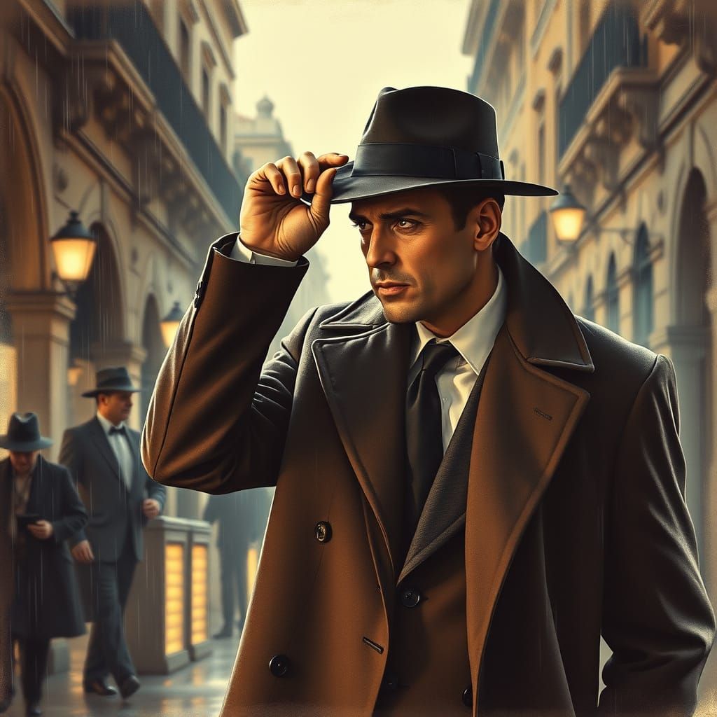 This image shows a stylish man walking down a rainy street in 1969 Casablanca. Warm light and cinematic shadows create a neo-noir mood, enhanced by vintage color tones in this hyperdetailed charcoal drawing.