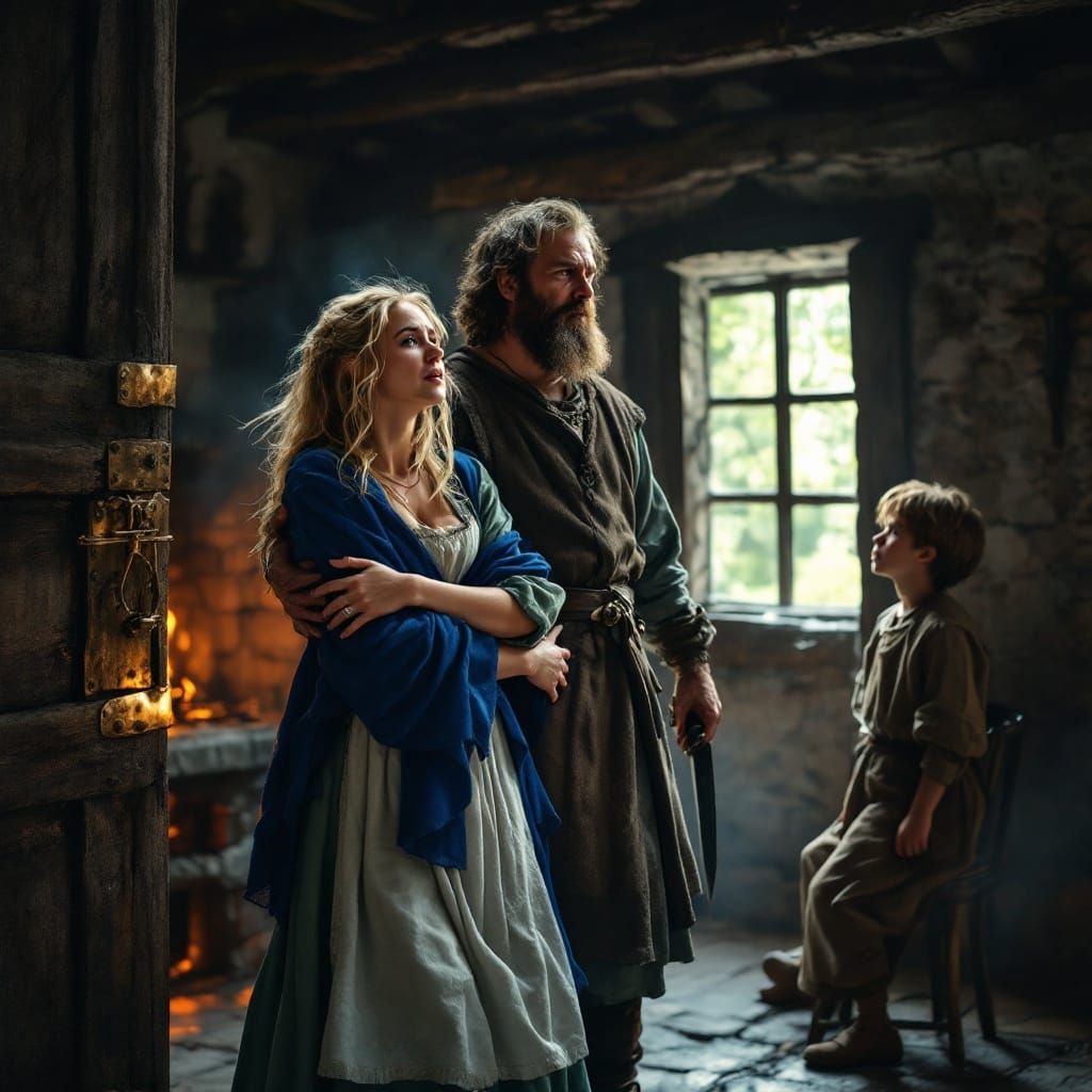 A poignant portrayal of a medieval family's distress, with a young woman clinging to her mother in shock, while their father stands guard and a brother looks on anxiously, set against the warm glow of a crackling fire in a beautifully rendered, low-lit interior