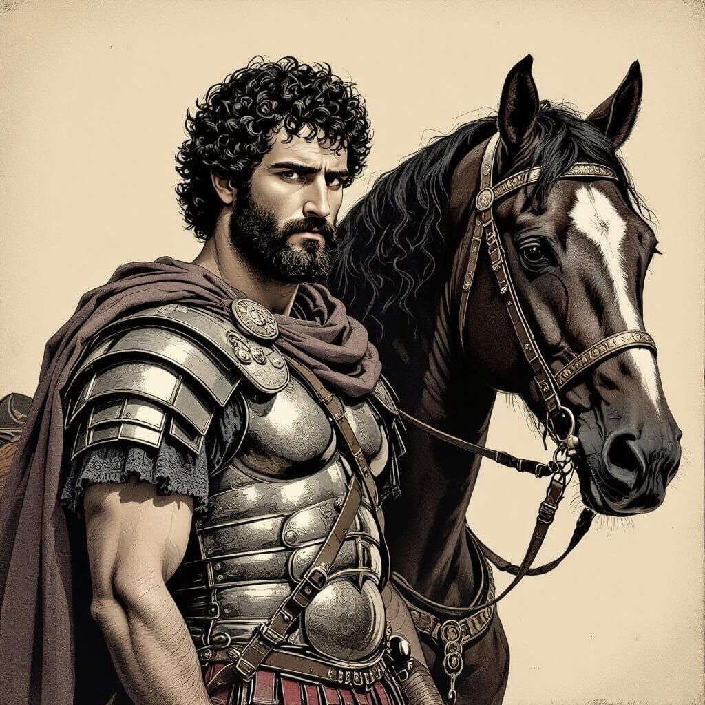 This image shows a Roman warrior and his horse in a classical black and white sketch. The drawing features cross-hatching and shading to create depth and texture.
