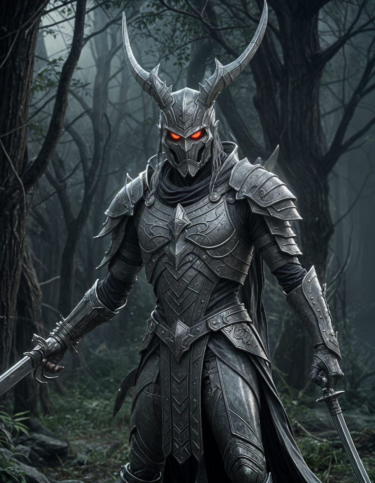 A vengeful spirit of a long-dead warrior, his ethereal form clad in spectral armor, wielding a ghostly sword that shimmers with an eerie light, in the 1970s dark fantasy book 3D Game Cinematic Feel, Epic 3D Videogame Graphics, Intricately Detailed, 8K Resolution, Dynamic Lighting, Unreal Engine 5, CryEngine, ...
