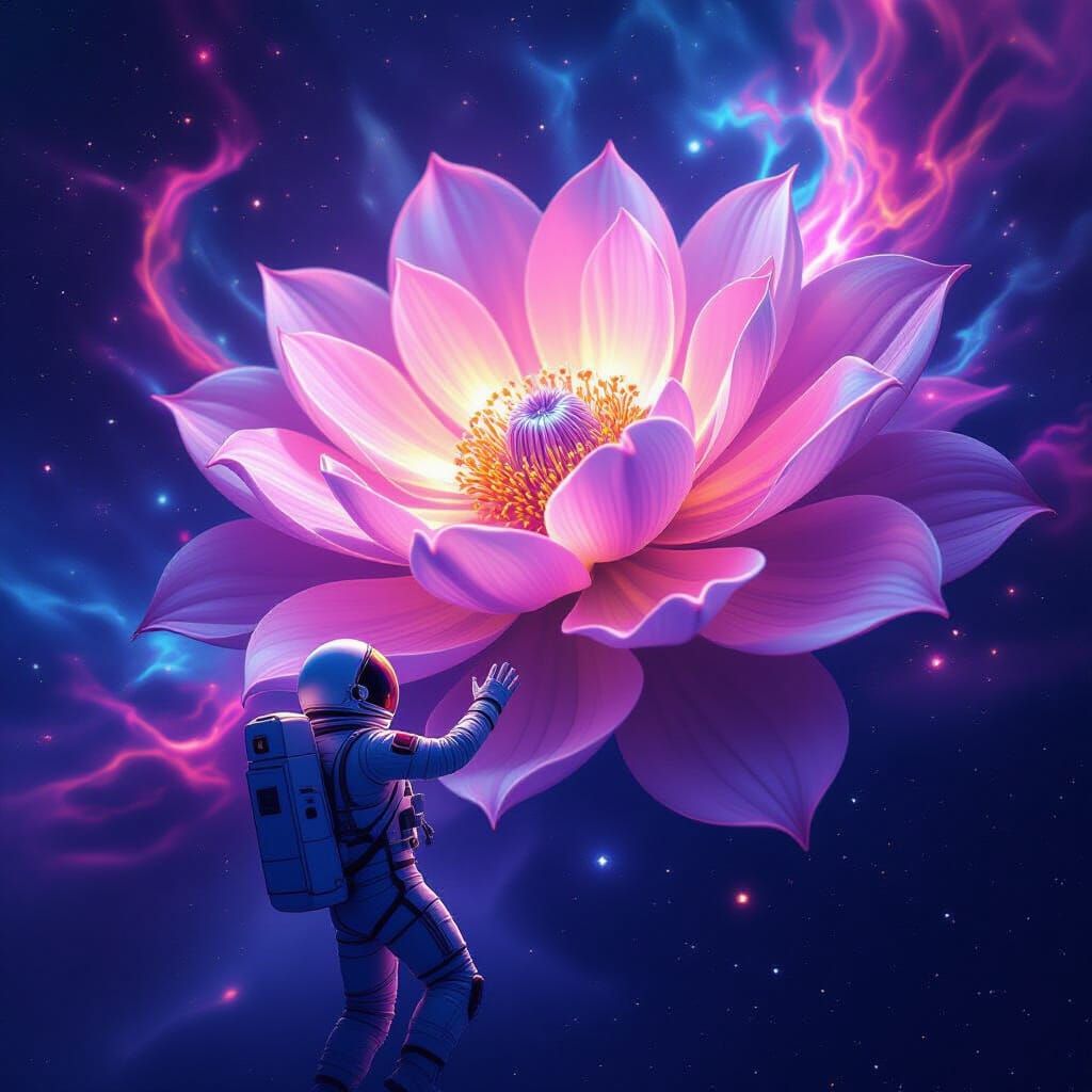 This image shows an astronaut floating in a vibrant, psychedelic nebula, reaching for a glowing cosmic flower made of stardust. Evokes awe and infinite possibility in a synthwave style.
