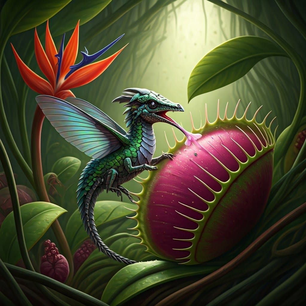 A detailed image of a tiny, iridescent HummingbirdDragon drinking nectar from a Venus flytrap. The surrounding flora is lush and exotic, rendered with biomechanical art style.