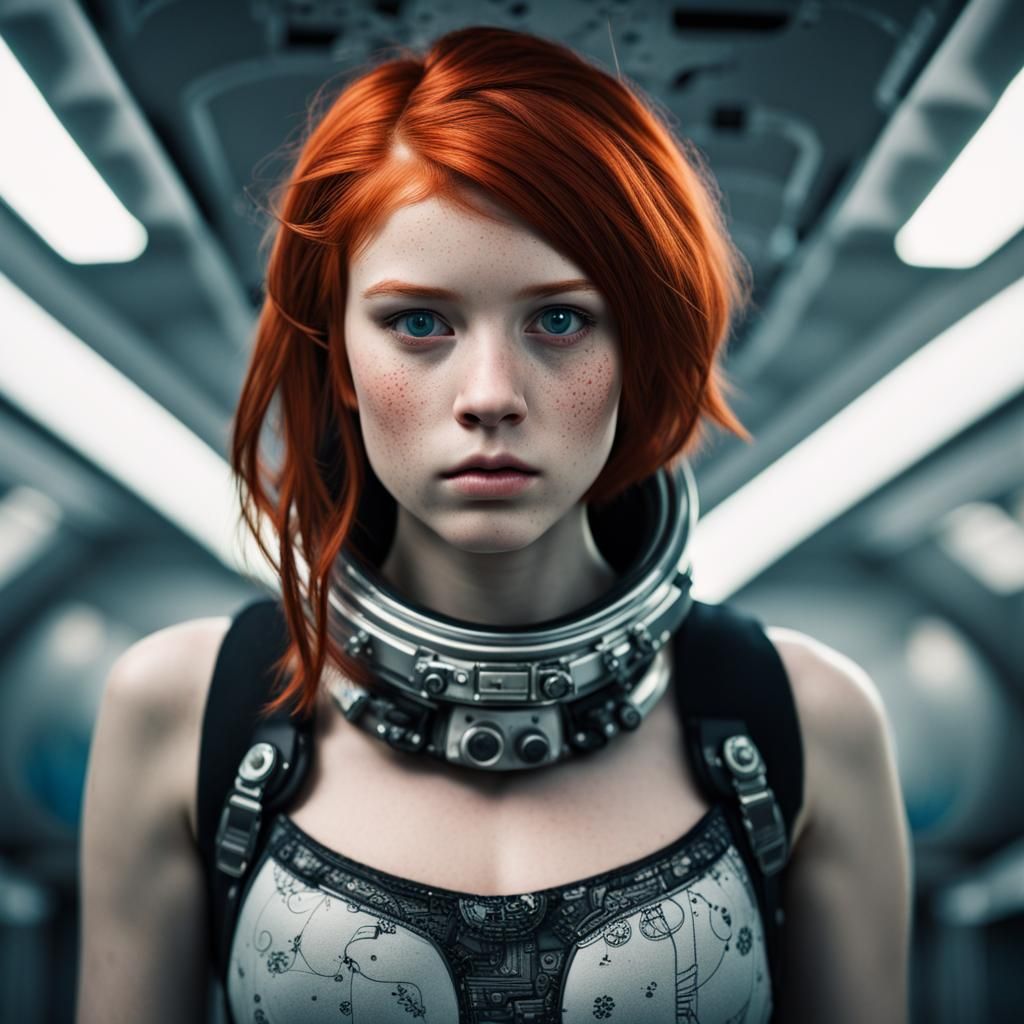 This image shows a full shot of a red-haired space girl with freckles and pouty lips. The hyperrealistic, cinematic image is highly detailed with a moody, atmospheric aesthetic.