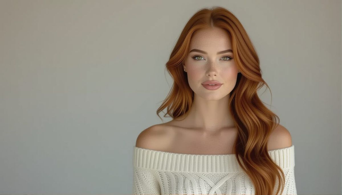 This image features a full body portrait of a young woman with tanned skin, amber eyes, and striking ginger hair with dark highlights. Captured with studio lighting for a professional look.