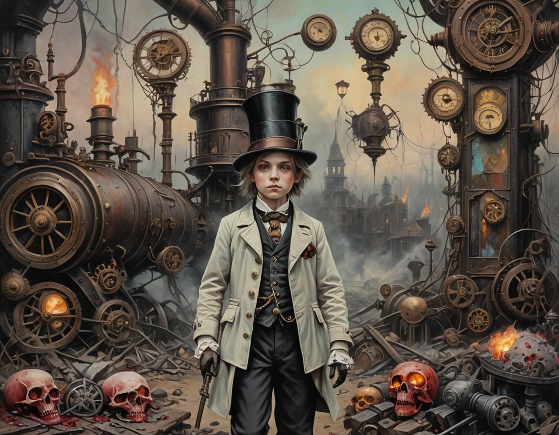 This image shows a full-length pastel drawing of a creepy, smiling boy. The gothic, surreal image features bloody, gory details and dark steampunk elements, conveying destruction.