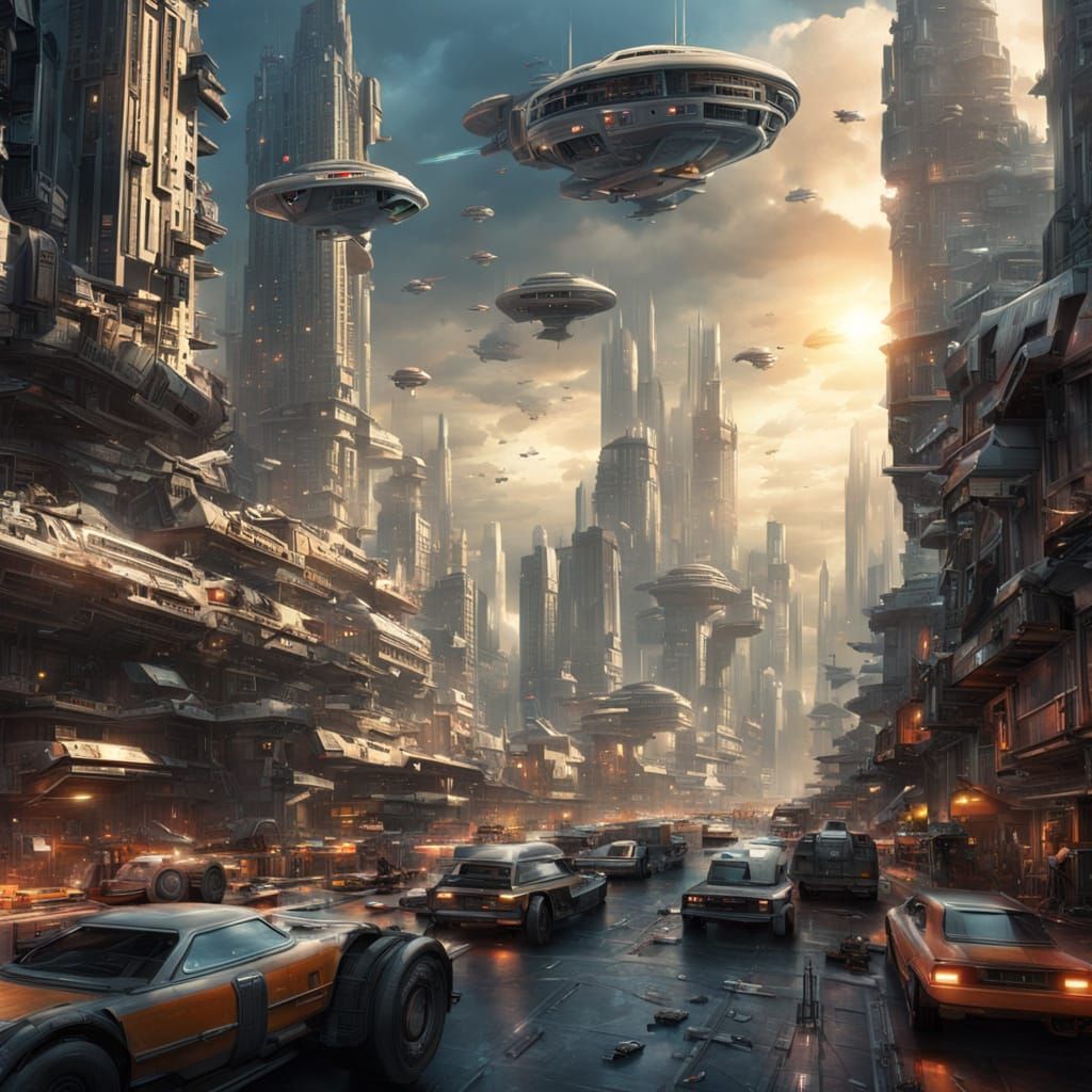 This image is a breathtaking depiction of a futuristic city, teeming with flying cars and towering skyscrapers, rendered in intricate digital detail with a cinematic, atmospheric style reminiscent of epic sci-fi landscapes.
