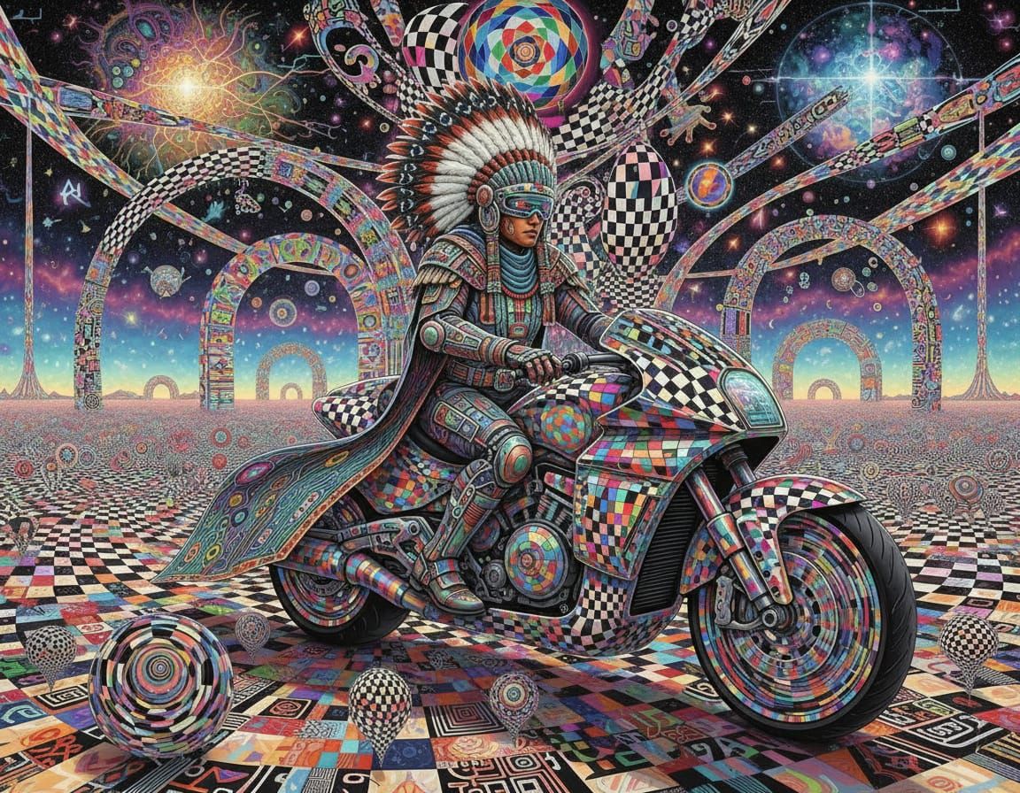 Retool and exemplify a mezzo-indian, curvileanear, continuous psychedelic shamanic-time-cop depiction of an integrated transdimensional driver riding a prototype ai-integrated cyborg-motorcycle