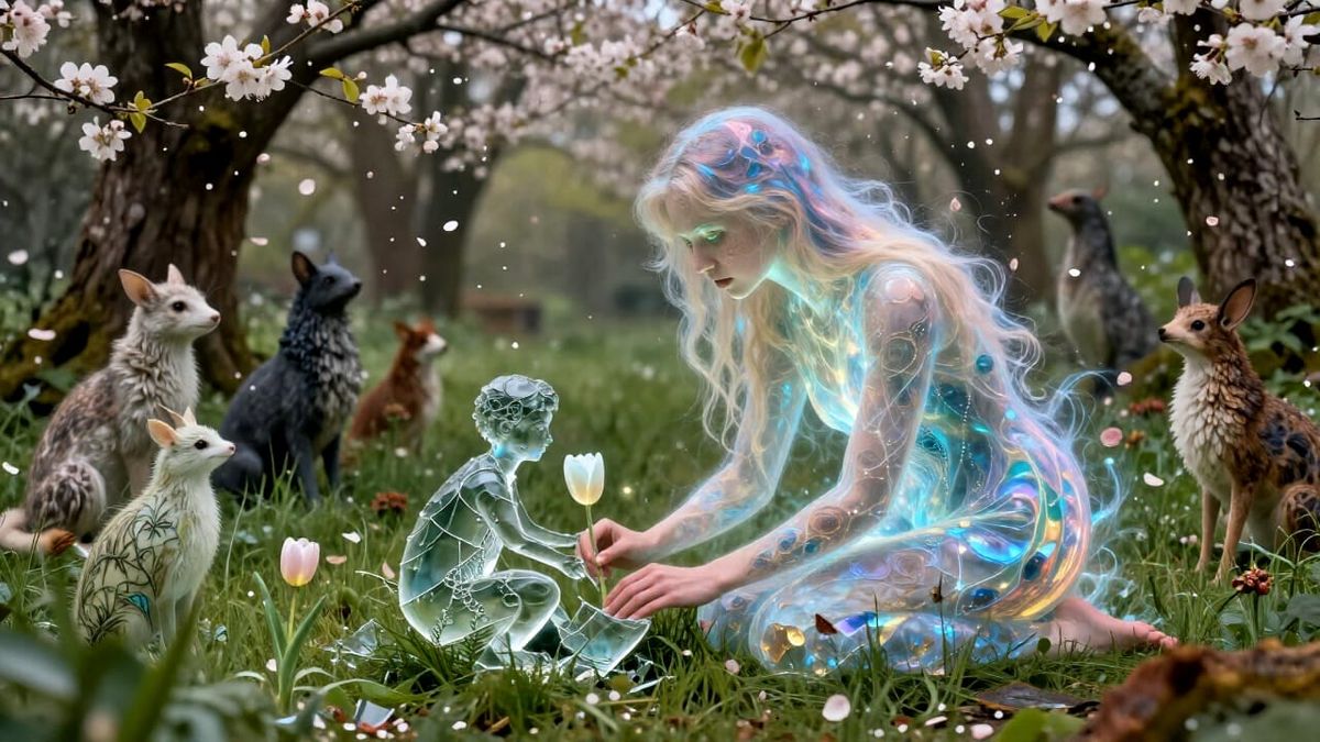 This image features a woman and man amidst liquid opal, with energy lines of dots and falling flower petals. It captures a surreal, dreamlike scene with inspiration from natural forms and delicate art styles.