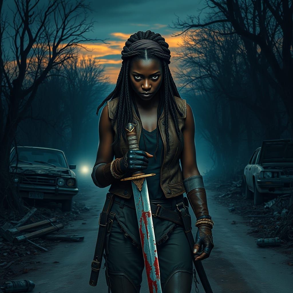 A hyper-realistic portrait of a woman with dark skin standing on a ruined road. She grips a katana, surrounded by overgrown foliage and wrecked cars, with cool blue and orange tones.