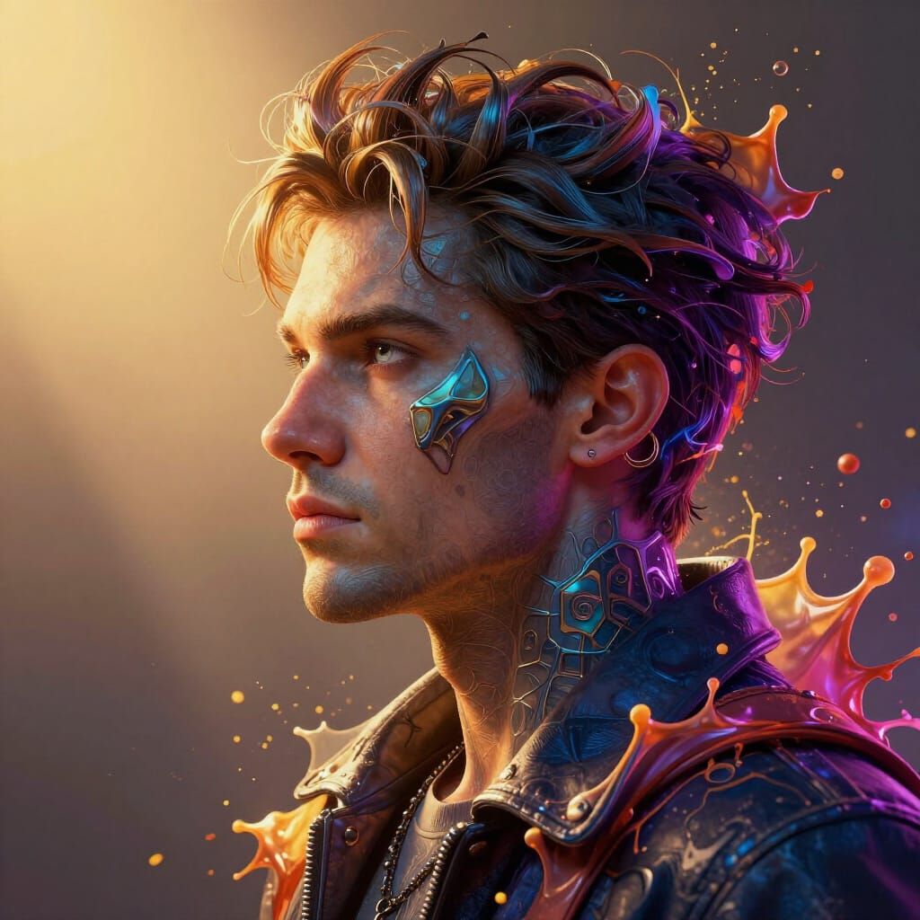 This image features a detailed head and shoulders portrait with dynamic lighting and a golden hour glow. Rendered in a hyperdetailed concept art style with triadic colors.