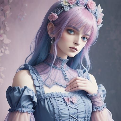 This image shows a close-up gothic portrait of a woman in a sheer pink and blue dress. The digital art features delicate lace details, a pastel color palette, and warm, soft lighting in a vibrant fauvist style.