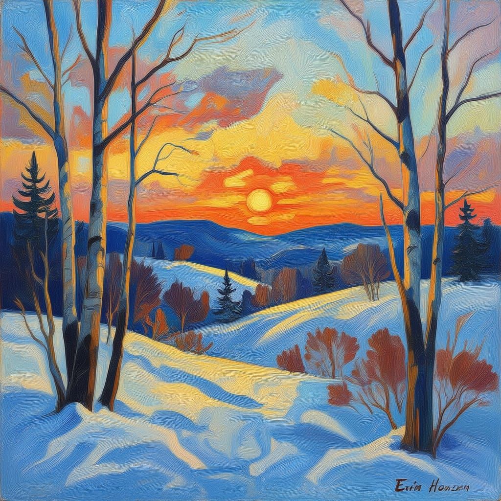 This image showcases a cool-colored winter landscape, inspired by the stained glass artistry of Louis Comfort Tiffany and the expressive brushwork of Erin Hanson.