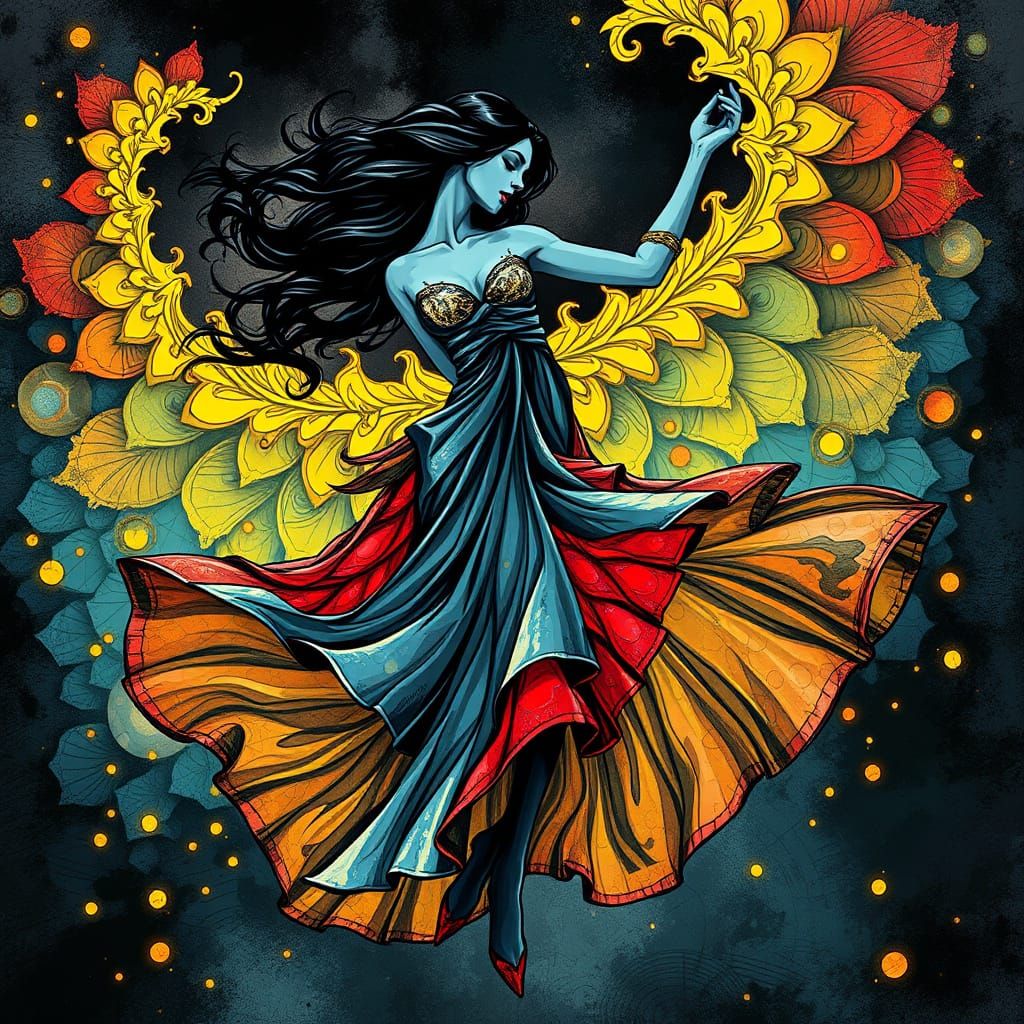 A digital painting of a woman dancing in a flowing dress, accented by shimmering yellow fractal ink. The artwork features metallic scales and bold outlines in a dramatic, detailed style.