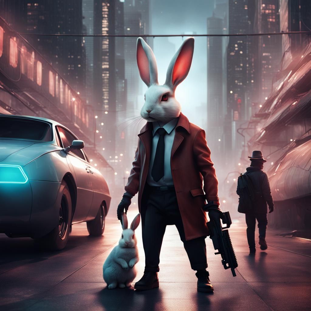 This image shows a gangster rabbit character in a futuristic city setting. The artwork features neon lighting and advanced technology, creating a cyberpunk aesthetic.