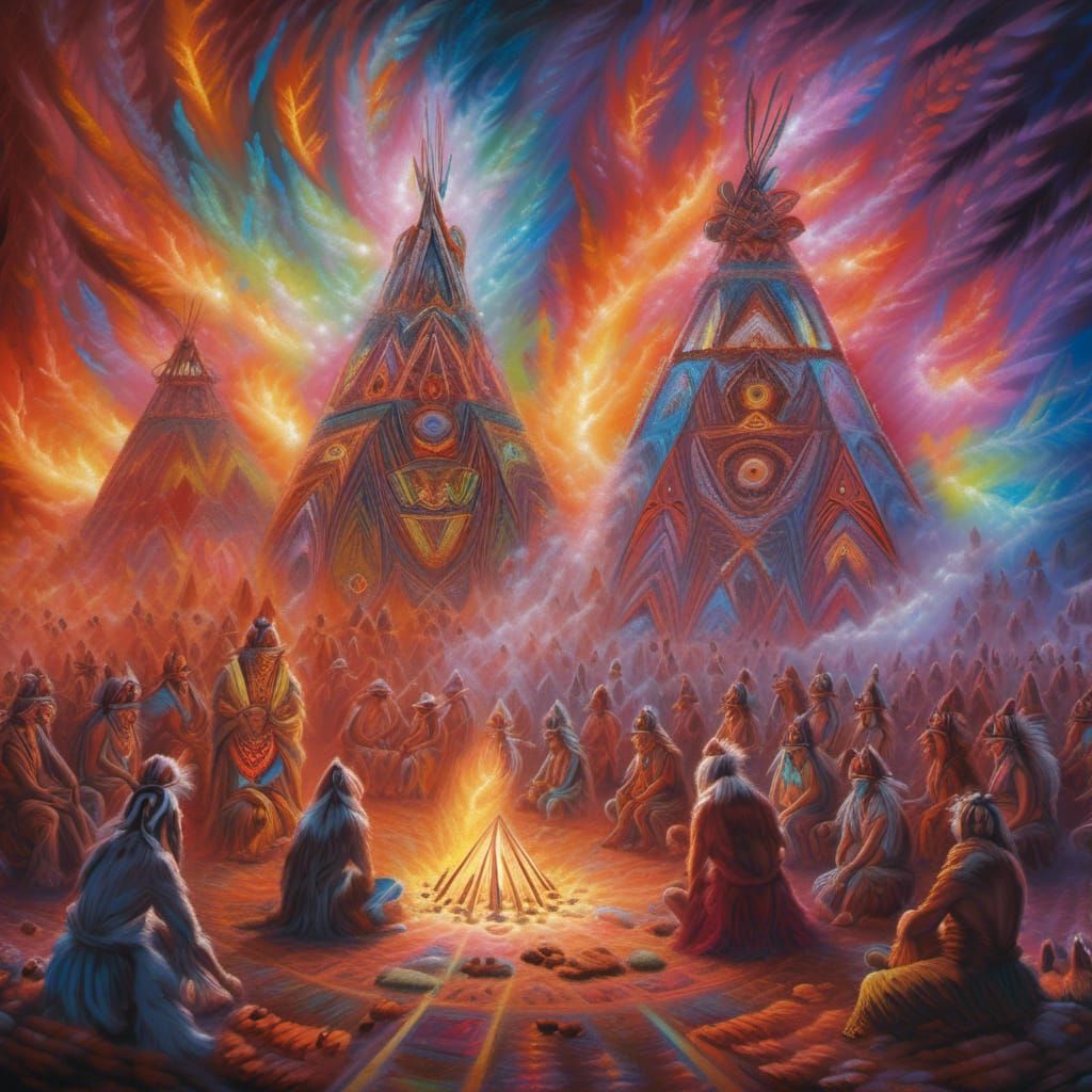 This image shows a sacred Pow Wow gathering of Native American elders and shamans around a telepathic fire. The scene features a magical, spiraling background of teepees and colorful cosmic smoke.