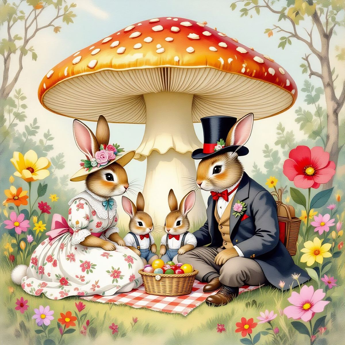 This image shows a whimsical forest clearing with giant flowers. Anthropomorphic rabbits in vintage attire are picnicking beneath a luminous mushroom in a soft, storybook style.