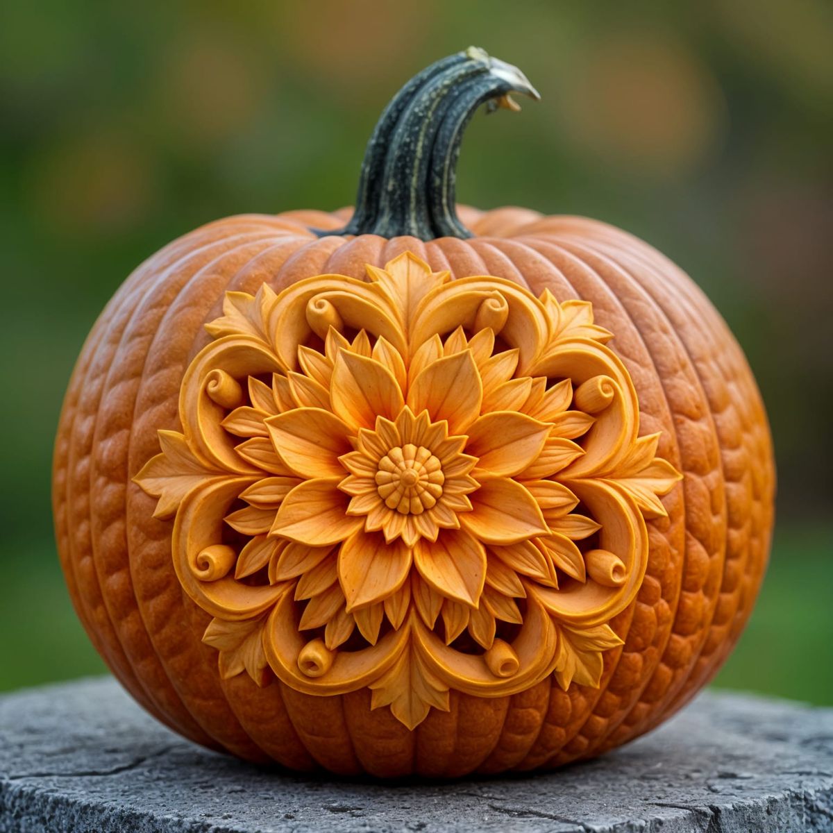 This image showcases an ornate and intricately carved pumpkin, highlighting stunning detail and craftsmanship in a beautiful display.