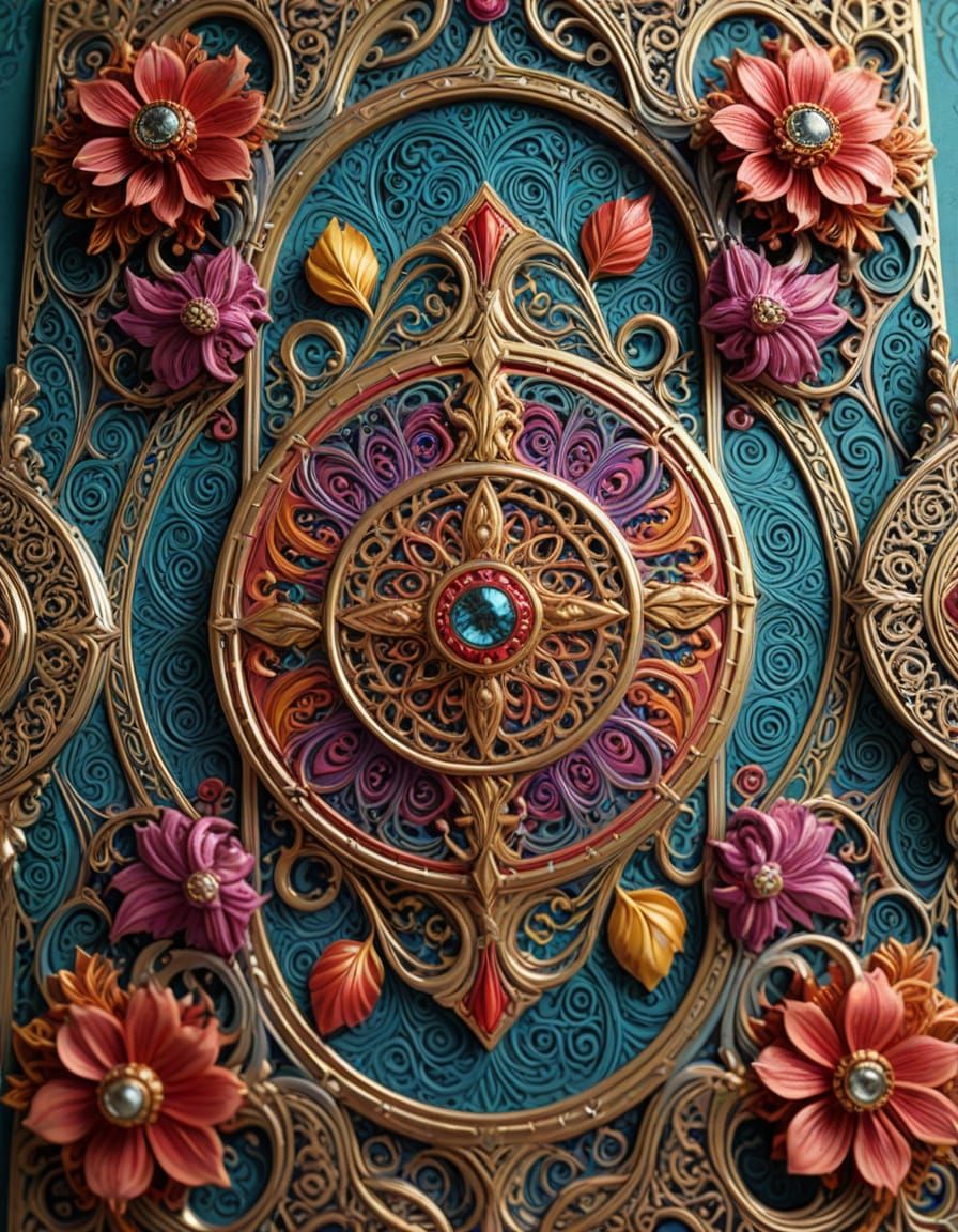 This image showcases a highly detailed playing card with intricate filigree patterns. It features vibrant, triadic colors and ornate edges, presented in a photorealistic 3D digital art style with dynamic lighting.