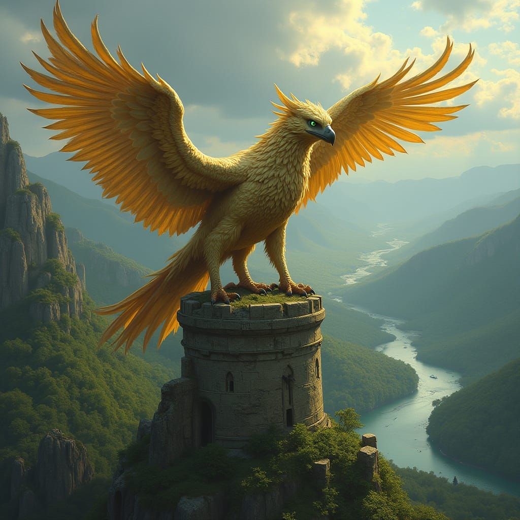 A striking picture of a griffin atop a weathered tower. The creature has golden feathers and emerald eyes and is watching over rolling hills and forests. The image is rendered in a dark fantasy style.