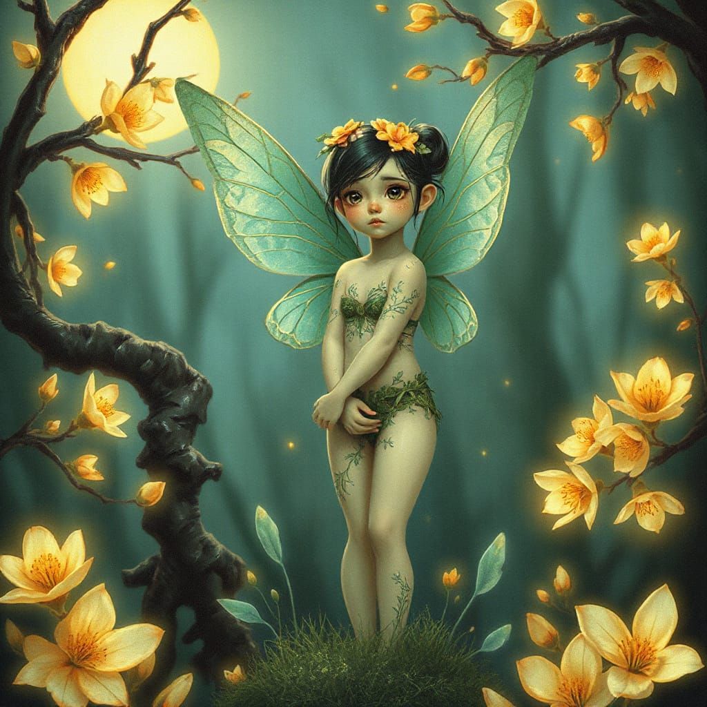 This image shows a forest fairy adorned with teal and gold vine tattoos, standing among glowing flora. The fairy's wings resemble shimmering leaves, evoking a sense of melancholy and forgotten times in a whimsical and intricately detailed style.