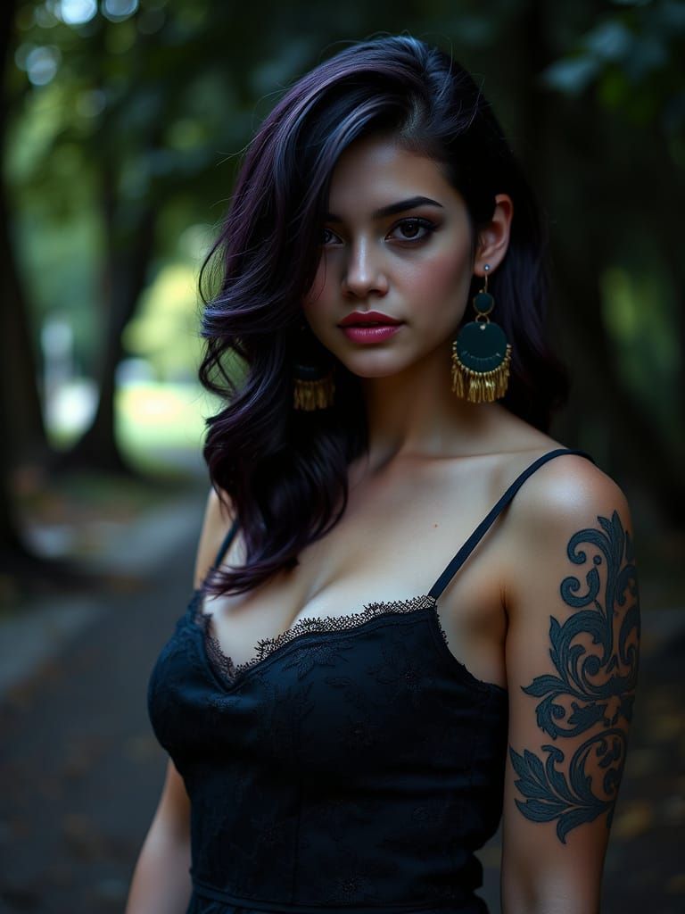 This image shows a woman with dark purple hair wearing a lacy black dress and tattoos. The cinematic photo features natural lighting and a shallow depth of field with a film grain effect.