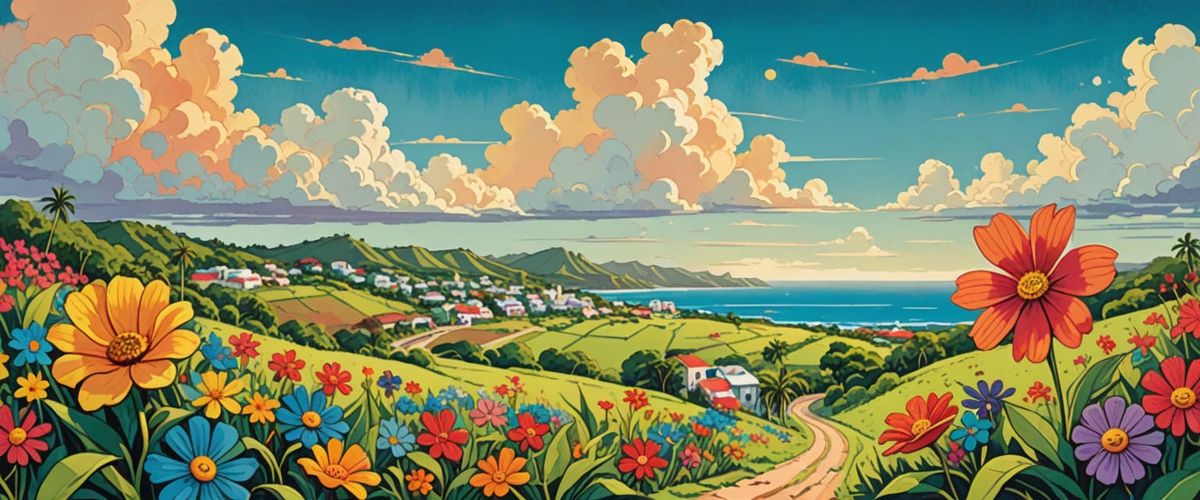 This image shows a vibrant Puerto Rican landscape with a vast sky and colorful flowers, rendered in a charming folk art style with soft, dreamy colors.