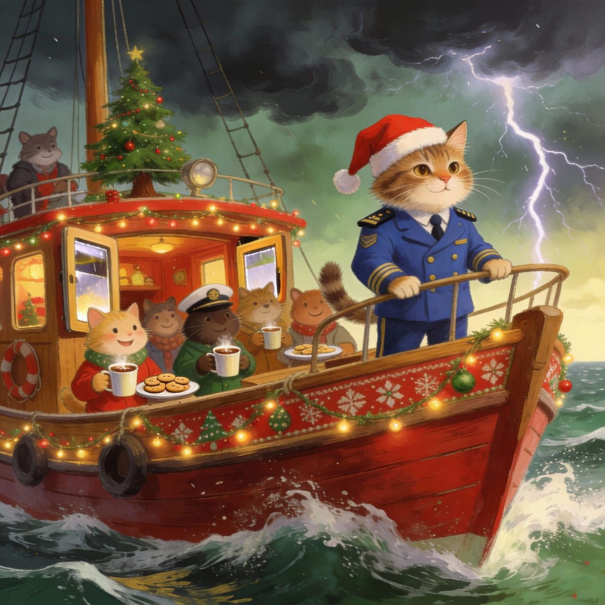 This image shows a cat sea captain celebrating Christmas aboard his boat with his crew. They are stranded due to a storm but are making the best of the situation.