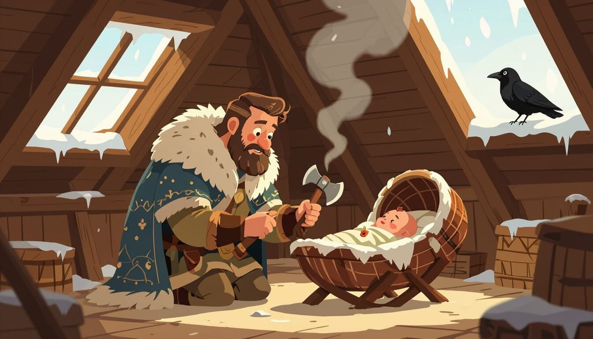 This 2D cartoon depicts a father placing an axe pendant on his baby's chest. Sunlight filters into the room, symbolizing love and survival, with a raven outside.