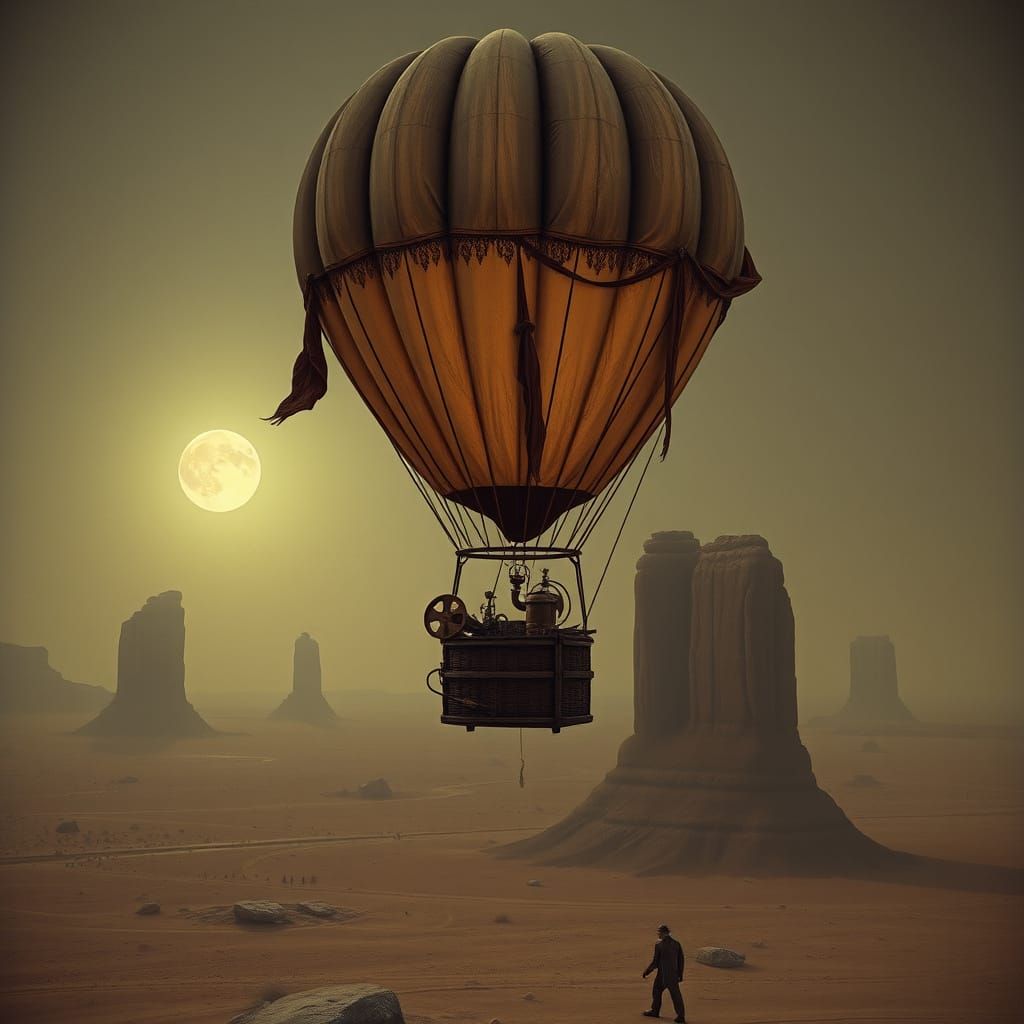 This image depicts a surreal, atmospheric scene of a damaged hot air balloon floating above a desolate desert at night. Strange rock formations and antique instruments add to the unsettling, grainy aesthetic.
