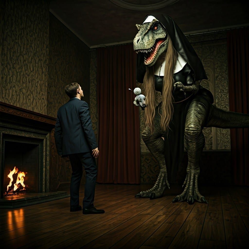 A haunting image of a man trapped in a dimly lit bedroom, face to face with a terrifying, humanoid T. rex in a nun's habit, exuding distorted terror in a dark, gritty, H.R. Giger-inspired aesthetic.