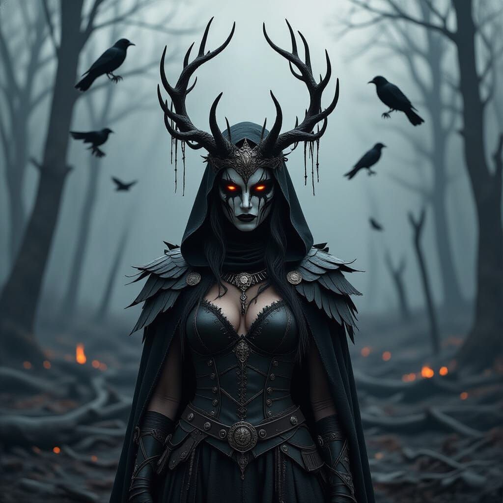 A striking picture of a horned queen in leather and feathers standing before a blighted forest. Ravens circle above her in this dark brown, coal black, and muted crimson scene of earthbound horror.
