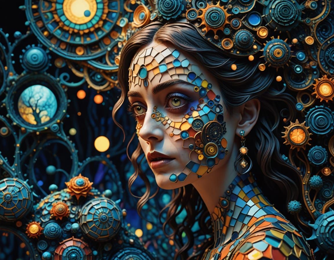 This image shows a woman on a journey in a Tim Burton-esque stop-motion animation. The scene features eccentric surrealism, mosaic patterns, and vibrant, hyperrealistic textures with golden hour lighting.