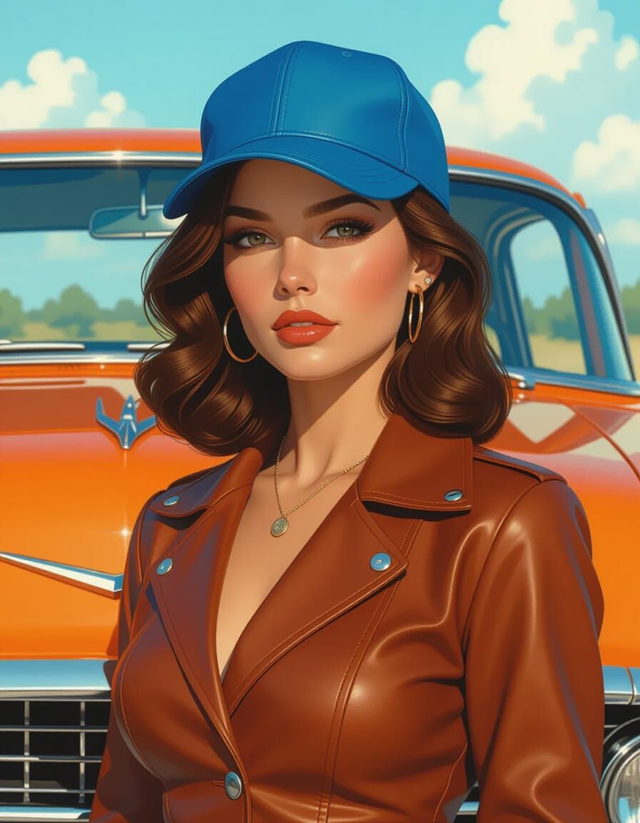 This image shows a woman in a leather outfit and baseball cap posing in front of a vintage car. The portrait, rendered in a hyperrealistic style, features side lighting and a colorful backdrop.