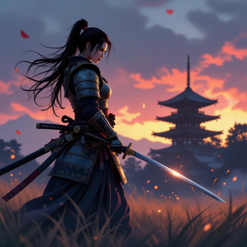 This image shows a fierce female warrior in detailed samurai armor on a battlefield at dusk. Her drawn katana reflects the fading sunlight. The scene has dramatic lighting and bokeh effects, inspired by detailed anime and fantasy art styles.