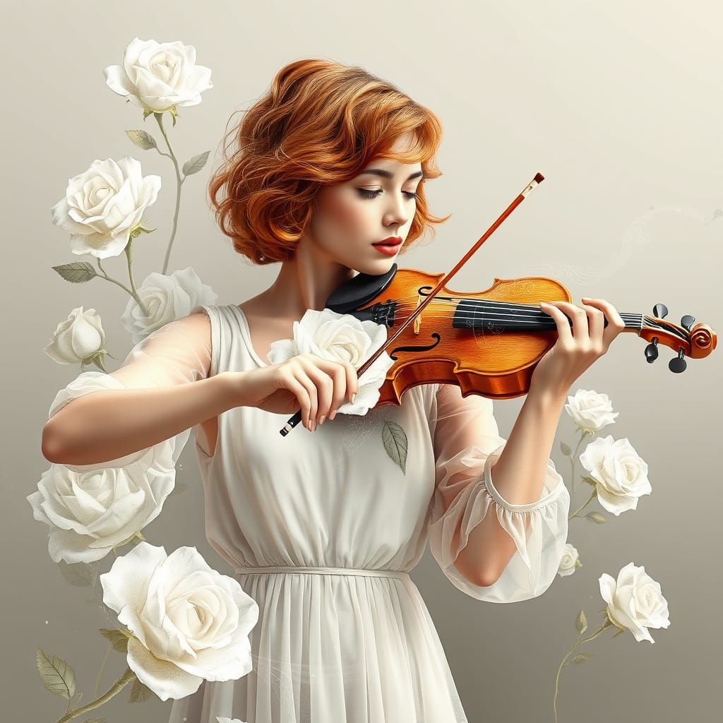 This image shows a beautiful young woman with copper curls playing a transparent violin. White roses surround her in a surreal double exposure effect with fractal and Zentangle patterns. The artwork has a platinum-gold tone.
