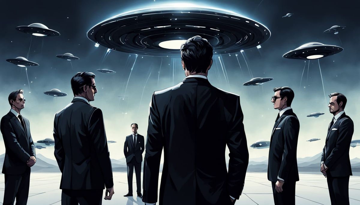 This image features a minimalist continuous-line illustration of two Men in Black agents. A fleet of UFOs arcs above them, suggested by simple curves and ellipses. The art style emphasizes clean lines and negative space for a quietly surreal effect.