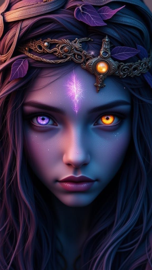 A fantasy concept art piece depicting a Sephardic witch with unique gold and lavender eyes and illuminated facial markings. Rendered in a detailed matte painting style with deep, complementary colors.