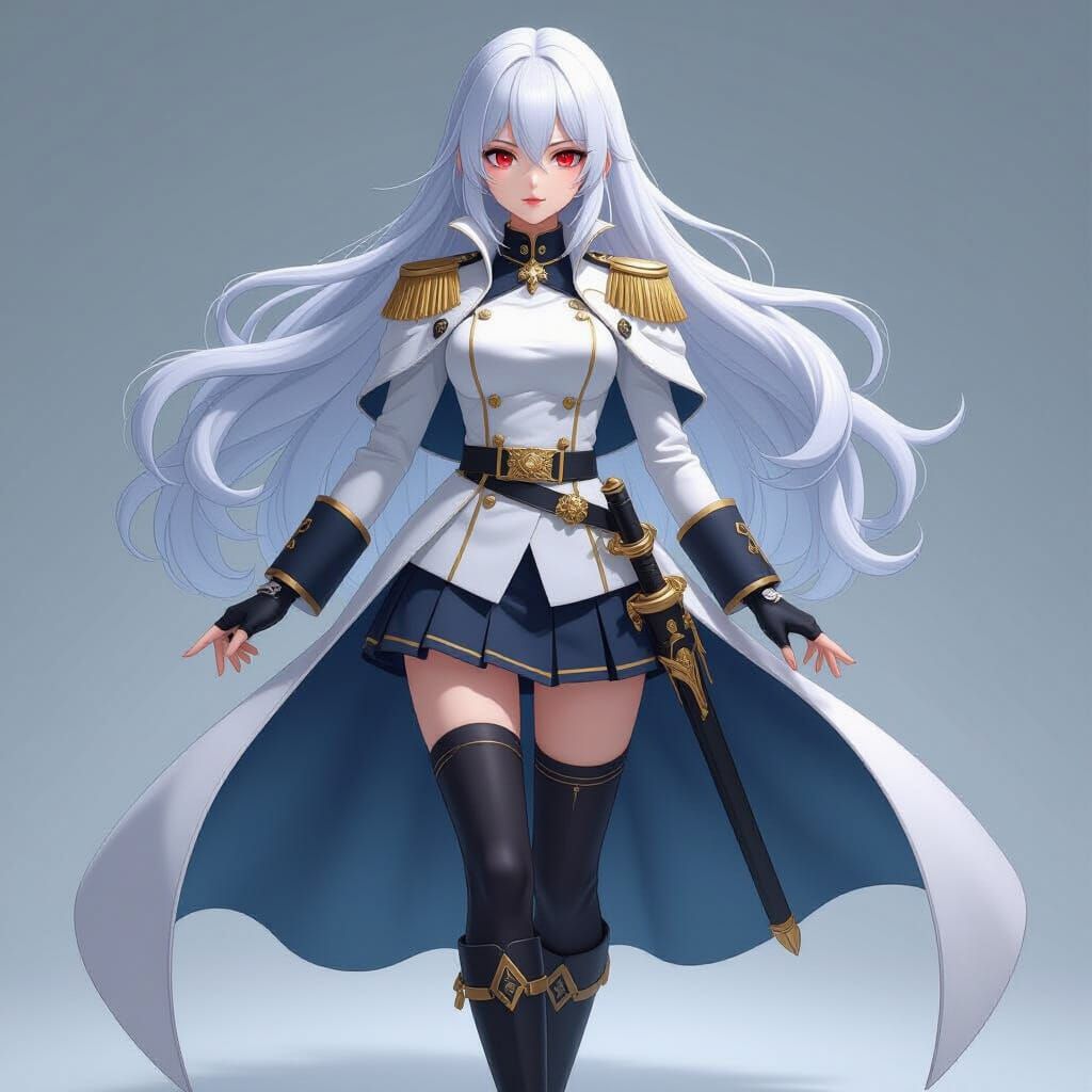 This image features a detailed anime female admiral with long white hair and red eyes, dressed in an elegant white navy uniform with a sword. Cinematic lighting and intricate design.