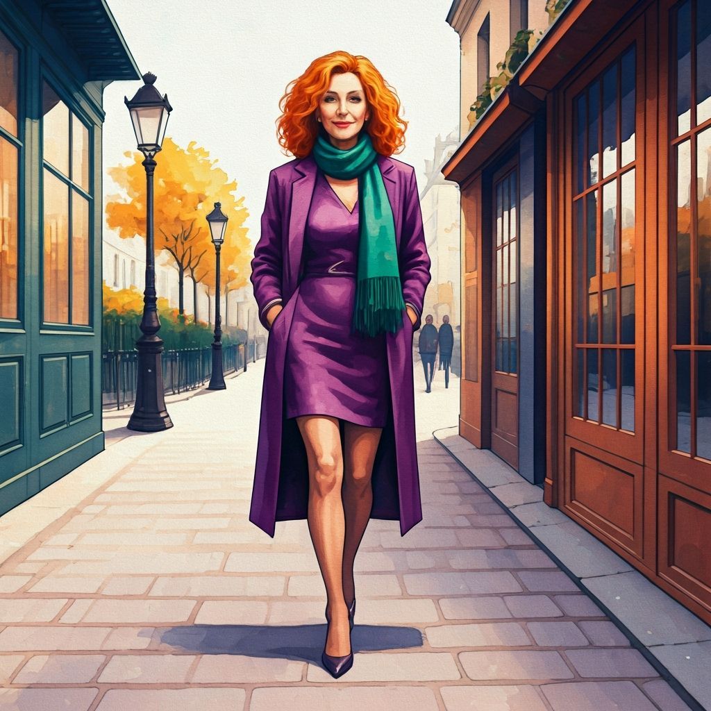 This image shows a stylish 60-year-old woman with red hair confidently walking in Paris. The watercolor painting captures an impressionistic aesthetic with vibrant colors and detailed features.