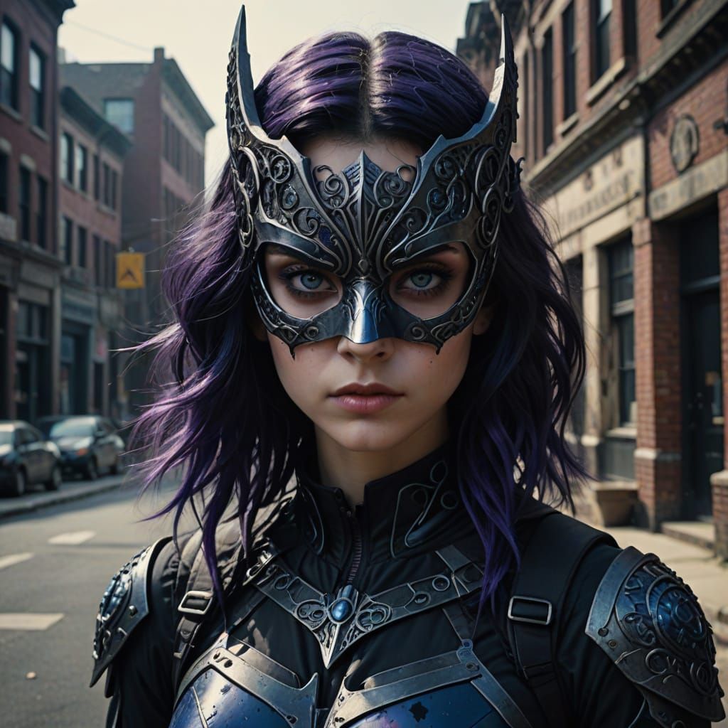 This image showcases a hyperrealistic digital portrait of a young superhero student. Featuring a 17-year-old American girl with striking purple and black hair, she wears an elaborate gothic-inspired costume and mask, presented in a dramatic, cinematic style.