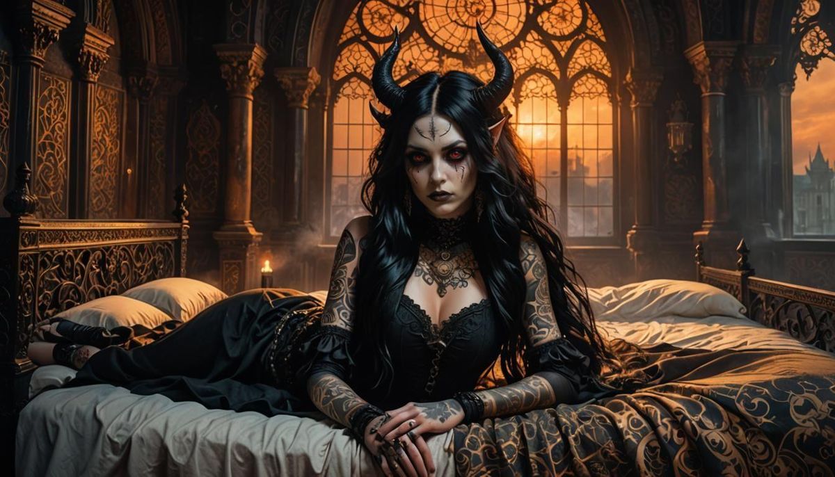 This image shows a gothic woman with ornate horns and red eyes reclining on a bed. The dark fantasy art features elaborate tattoos, ethereal lighting, and a detailed, eerie atmosphere.