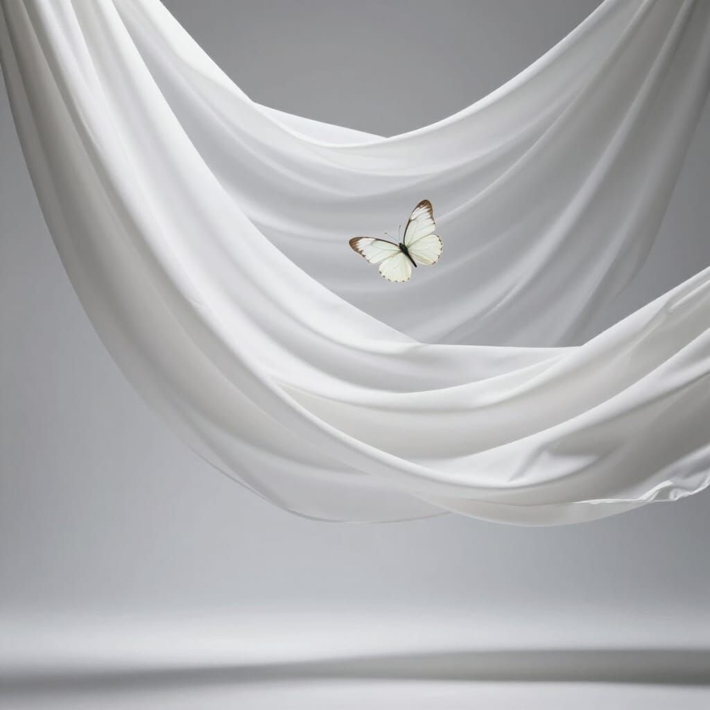 This fine-art photograph captures stark white silk dramatically lit, creating tension and movement. A butterfly is frozen mid-flight, highlighting fragile beauty in a minimalist setting.