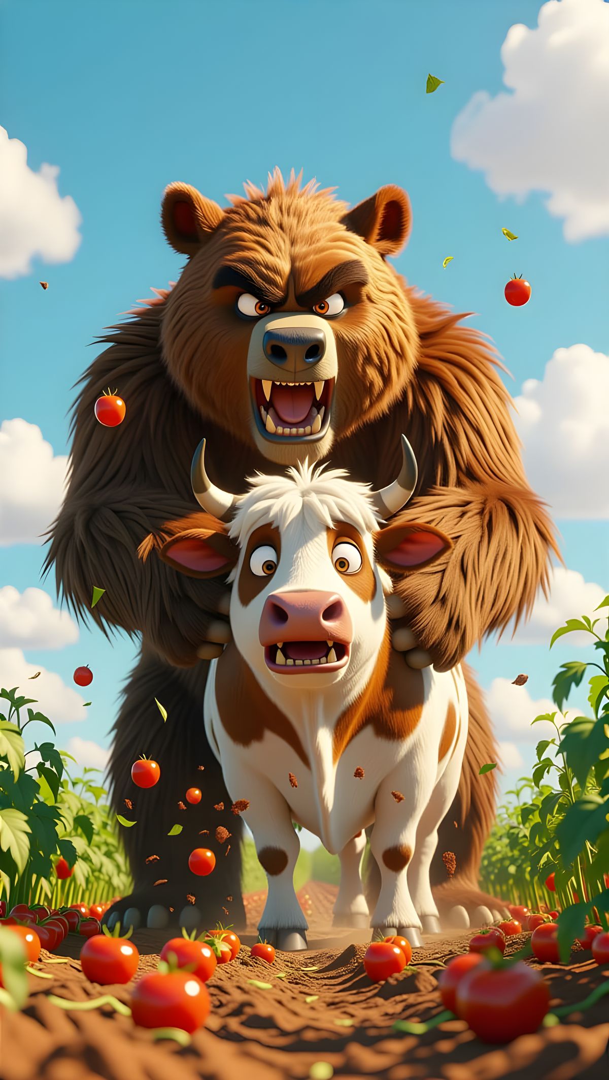 This image shows an enormous brown bear violently slamming a white and brown cow onto the ground in a tomato field. The scene is captured as vibrant, highly detailed 3D rendering with exaggerated expressions.