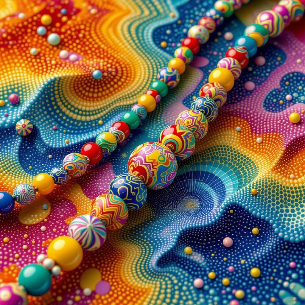 A vibrant display of rainbow-colored beads featuring complex abstract fractal patterns and wave-like ripples. The 3D render includes subtle shading, capturing a modern digital art aesthetic.