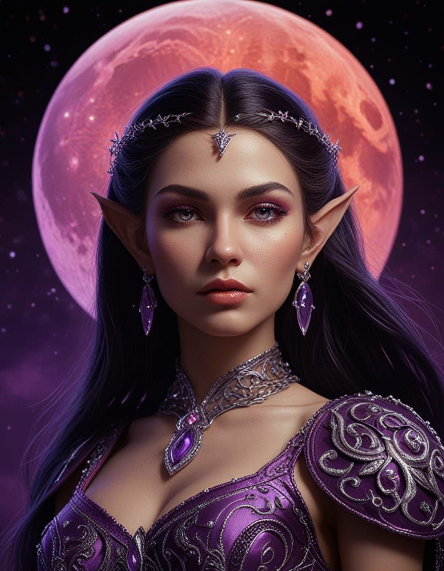 A close-up portrait of an elf sorceress with glowing violet magic. Shimmering embroidery catches the soft lunar light in this hyper-realistic digital artwork. Purple mist enhances the dreamy, mystical atmosphere.