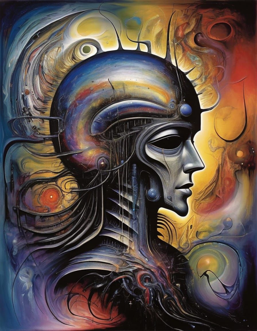 This image shows a surreal knight's helmet dissolving into cosmic horror tendrils amidst a vibrant nebula. Abstract art with pulsating energy and clashing colors, featuring textured brushstrokes.
