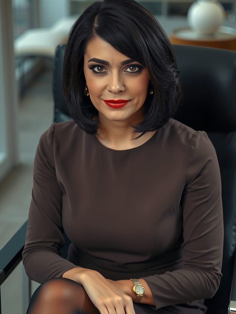 This portrait features a poised, mature woman with striking features, exuding confidence and elegance in a professional workspace, reminiscent of classic 35mm film noir aesthetics.