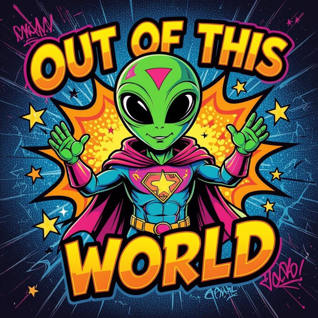 A vibrant cartoon alien superhero in a dynamic pose, surrounded by neon graffiti and comic-style explosions. Features bold text and a print design suitable for youth apparel.