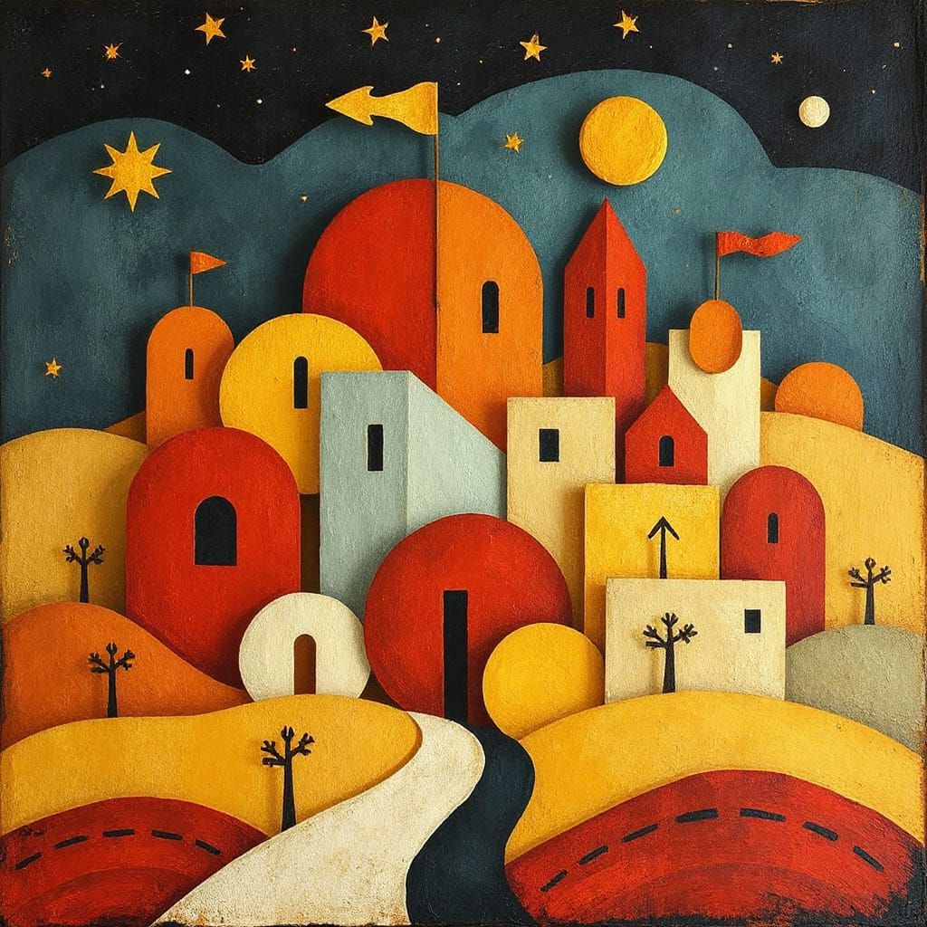 A dreamlike landscape composed of colorful blocks and abstract geometric shapes, resembling a city in a dream. The hand-drawn textures evoke a childlike, symbolic feel, in a whimsical, abstract style.